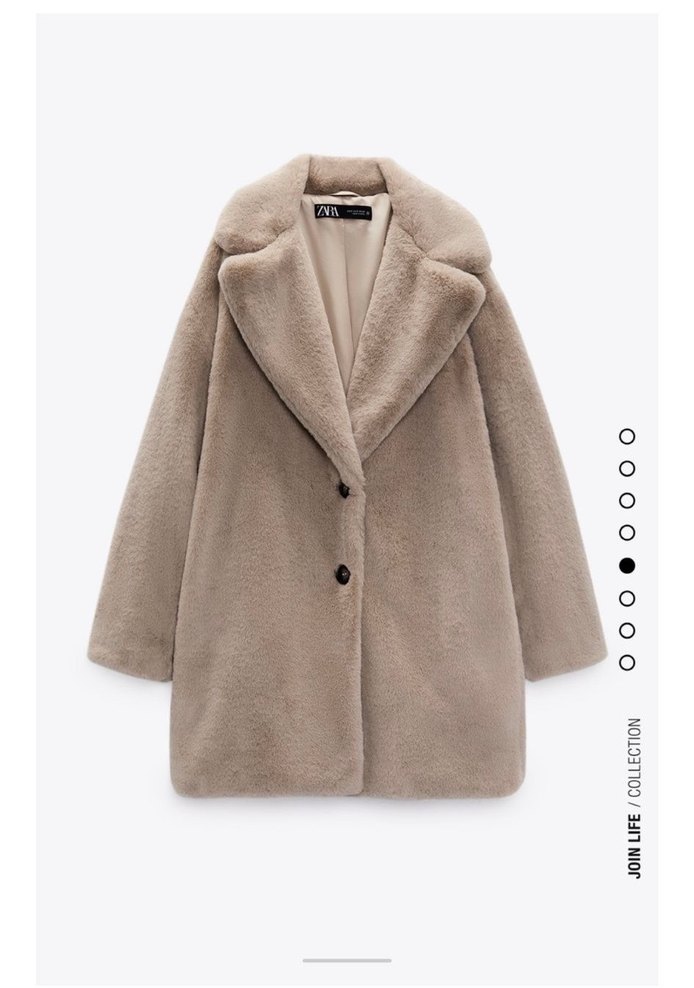 Bej kadın peluş kaban, notched lapel yaka ve bol kesimlidir. Uzun kollu ve midi boydadır, yumuşak fleece kumaştan yapılmıştır, günlük kullanıma uygundur.