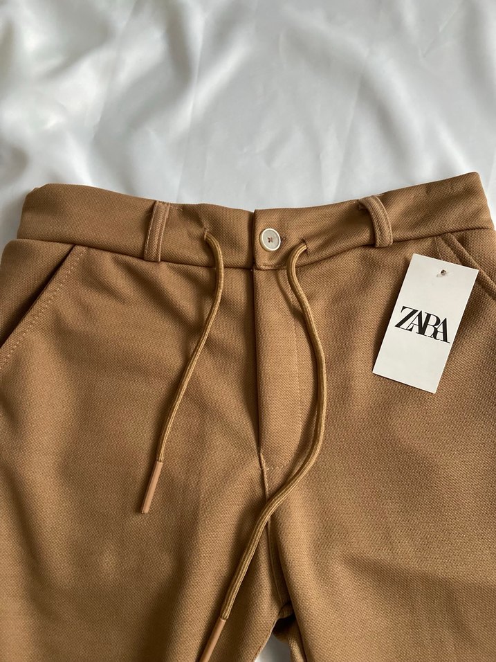 Zara markalı, bej renkte, regular fit kesime sahip, fermuarlı kumaş pantolon. Midi boy ve günlük kullanıma uygun rahat bir model.