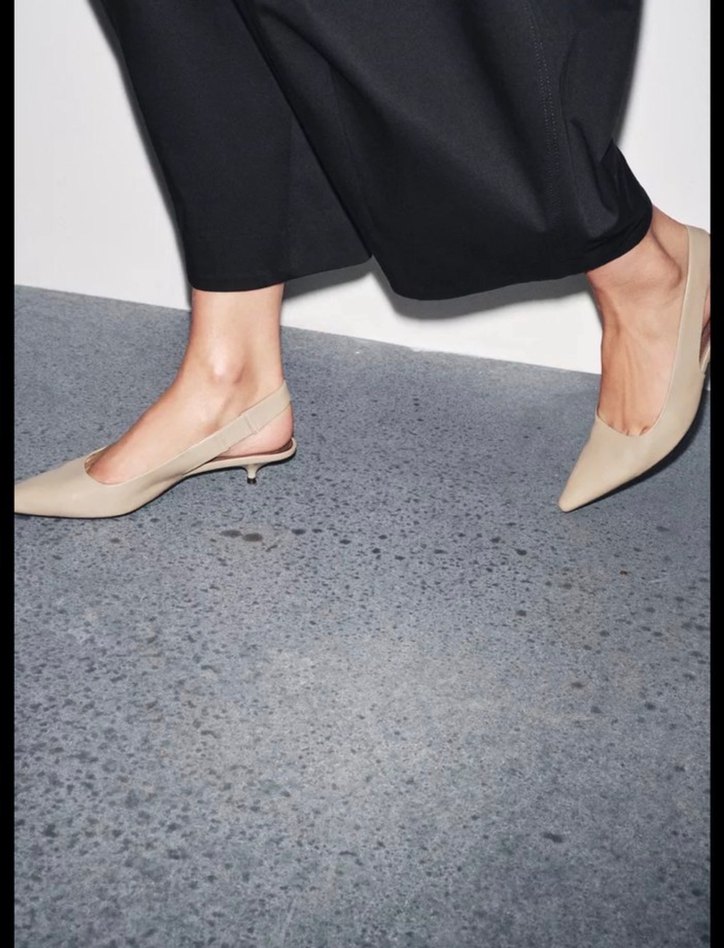 Minimalist tasarımlı, bej renkte stiletto topuklu ayakkabılar, ofis kullanımı için kauçuk tabanlı ve şık görünümlüdür. Zarif ve çağdaş bir stil sunar.