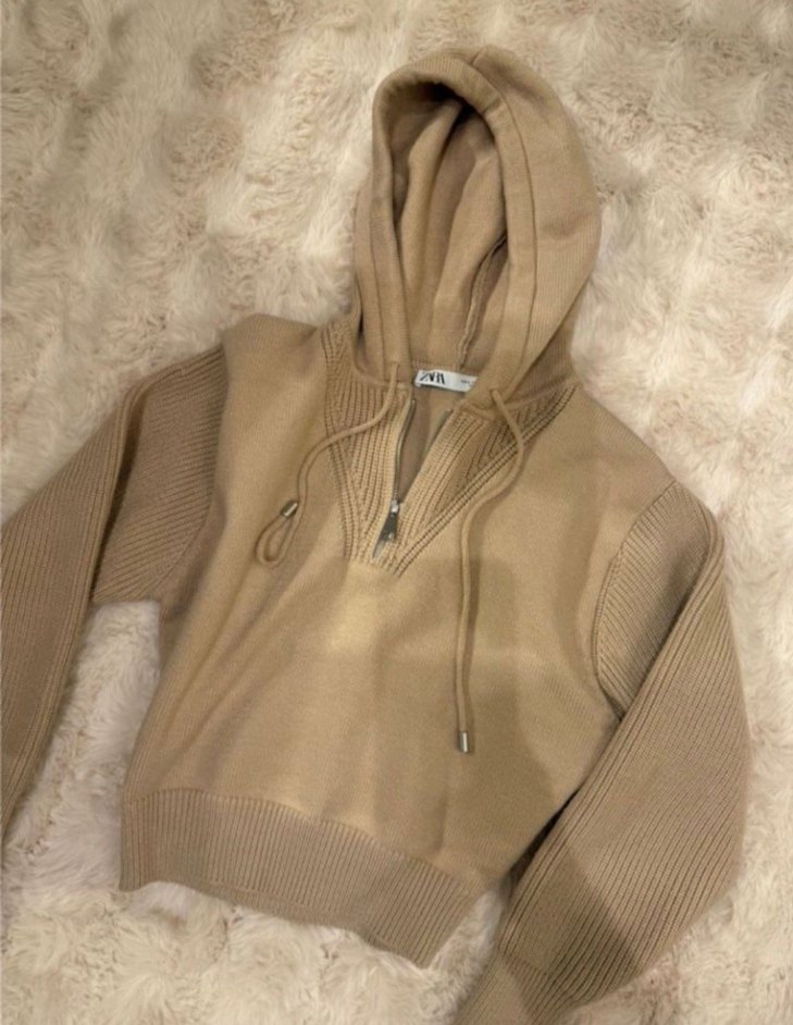 Bej renkte, kapüşonlu, uzun kollu, bol kesim kadın kazak. Yumuşak kürk detayları ve midi boy ile rahat bir sokak stili sunar.
