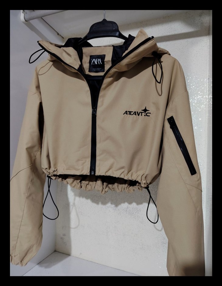 Zara Bej renkli, kapüşonlu,mini kesim belden büzgü aparatlı crop ceket. Fermuarlı ve baskılı detaylara sahip.. Bedenleri XS S M L. Ölçüsü kolatından 56 cm boyu 41 cm