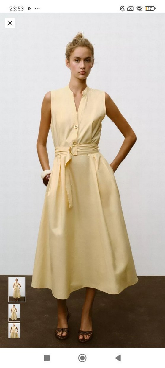 Bej renk, kolsuz, V yaka ve kemerli uzun elbise, ipeksi kumaştan klasik ve şık bir görünüm sunar, ofis için uygundur.