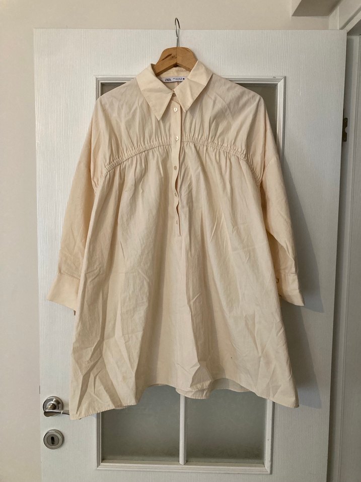 Orjinal Zara marka Bej keten kumaştan, düğmeli, uzun kollu, yakalı ve midi boyda bol kesim gömlek. Düz ve pastel renkte, günlük kullanım için uygundur. gömleğin bazı yerleribde minik lekeler mevcut fotoğrafta gösterdim.