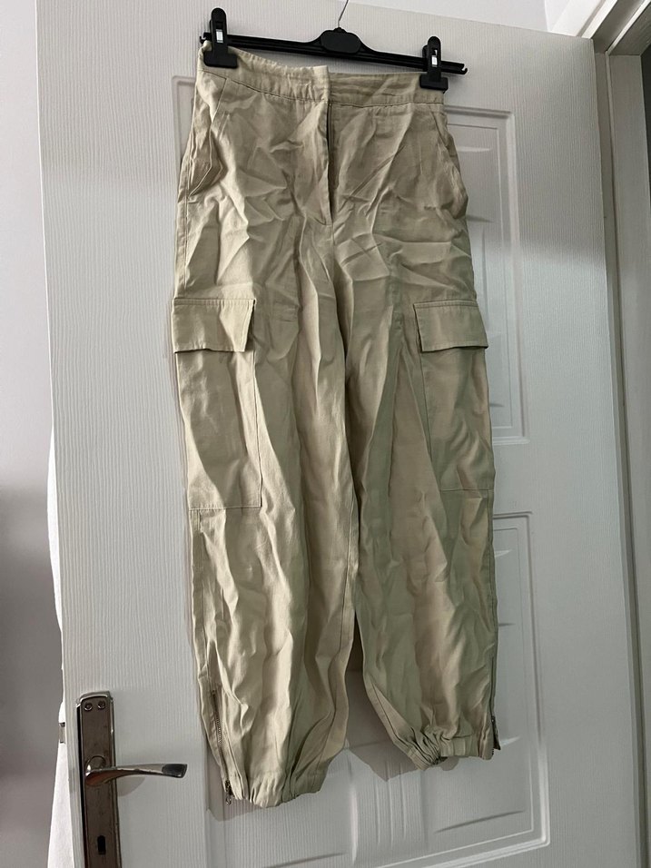 Bej keten kumaştan, rahat kesim, midi boy kadın pantolon. Sokak stiline uygun, cep detaylı, dış mekan için rahat bir seçim. Çok kırışık çıkmış ama çok güzel tarz bir alt