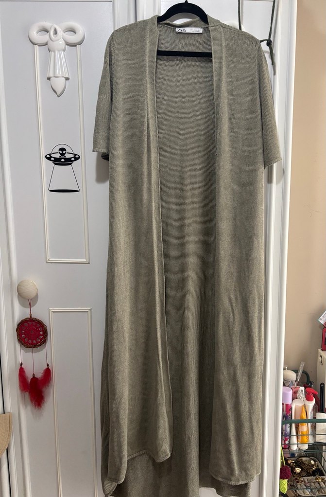 Bej keten uzun hırka, salaş kesim, drapeli kısa kollu ve yuvarlak yaka ile minimal stil için uygundur.