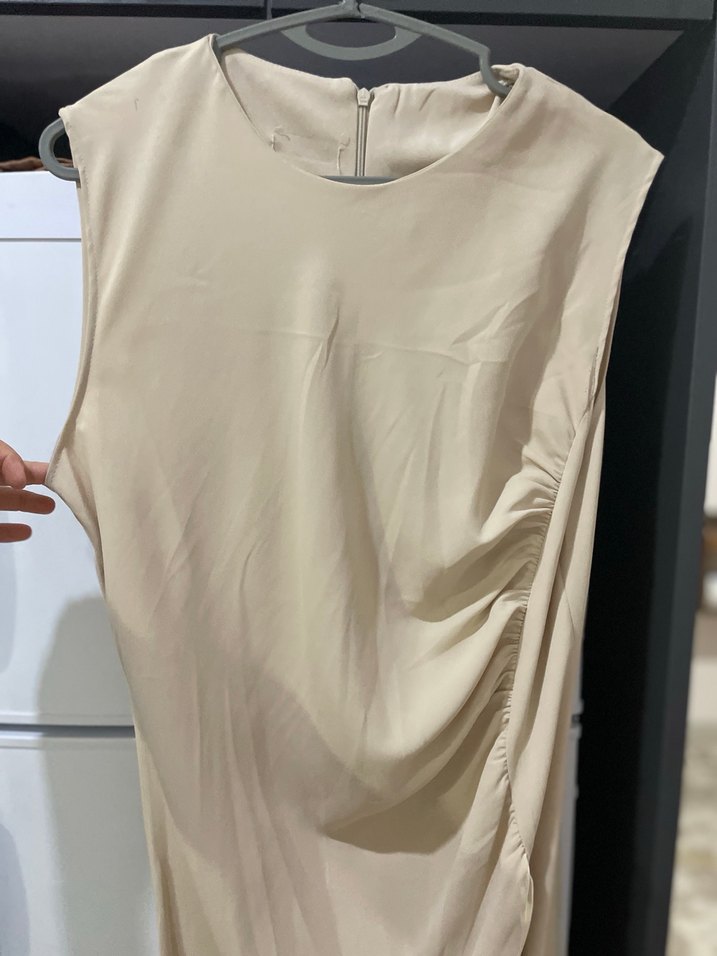 Bej renkli, kolsuz midi elbise. Vücuda oturan kesimi ve drapeli detayı ile yumuşak keten kumaştan üretilmiştir. Yuvarlak yaka ve arka fermuar içerir.