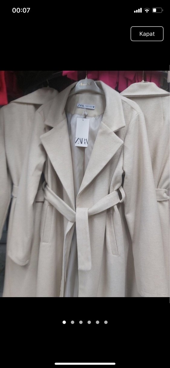 Bej renkli Zara kaban, kuşaklı ve yan cepli tasarıma sahiptir. Klasik yaka ve yumuşak dokusu ile şık bir görünüm sunar.