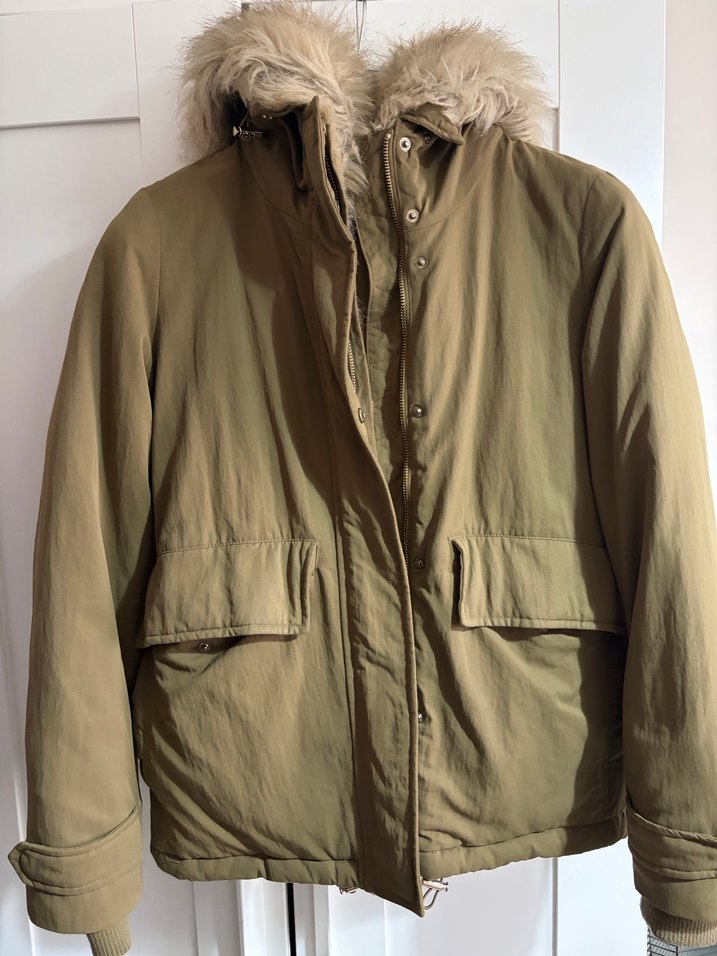 Zara Bej renkte, midi boy, kapüşonunda kürk detaylı kadın mont. Geniş kesim ve uzun kollu, yumuşak ve sıcak kumaştan outdoor kullanım için uygundur.