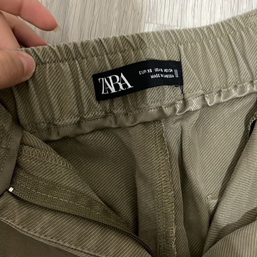 Zara marka, keten kumaştan, bej renkli, rahat kesim ve midi boy fermuarlı kadın pantolon.