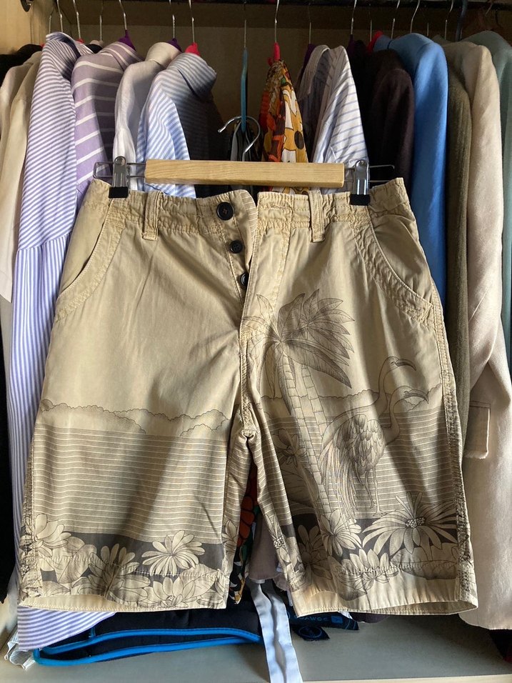 Bej renkli, bol kesim midi şort, kemerli ve hafif tropikal desenli, günlük rahat kullanım için uygun. Birkaç kez giyildi
