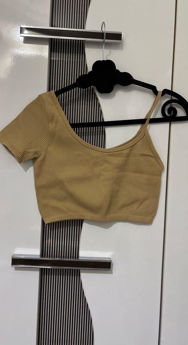 Bej renkli, tek kısa kollu ve tek askılı, yumuşak sentetik kumaştan yapılmış dar kesim crop top. Rahat ve şık bir günlük kullanım parçası.