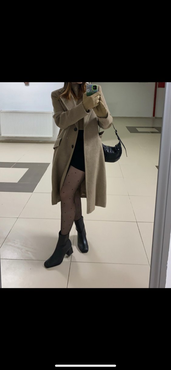 Zara markalı, tek düğmeli ve kapaklı ceplere sahip uzun bej kaban. Yumuşak ve sıcak kumaştan üretilmiştir.