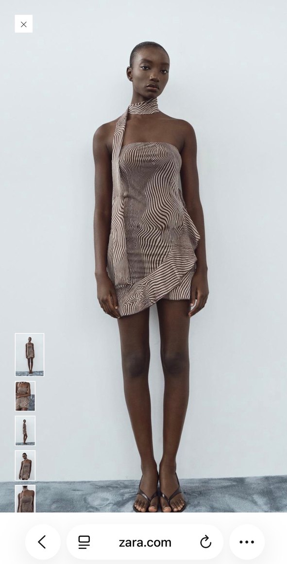 Bej ve gri tonlarda zebra desenli, straplez yakalı, drapeli detaylı, sentetik kumaştan mini ve vücuda oturan avant-garde tarzda elbise.