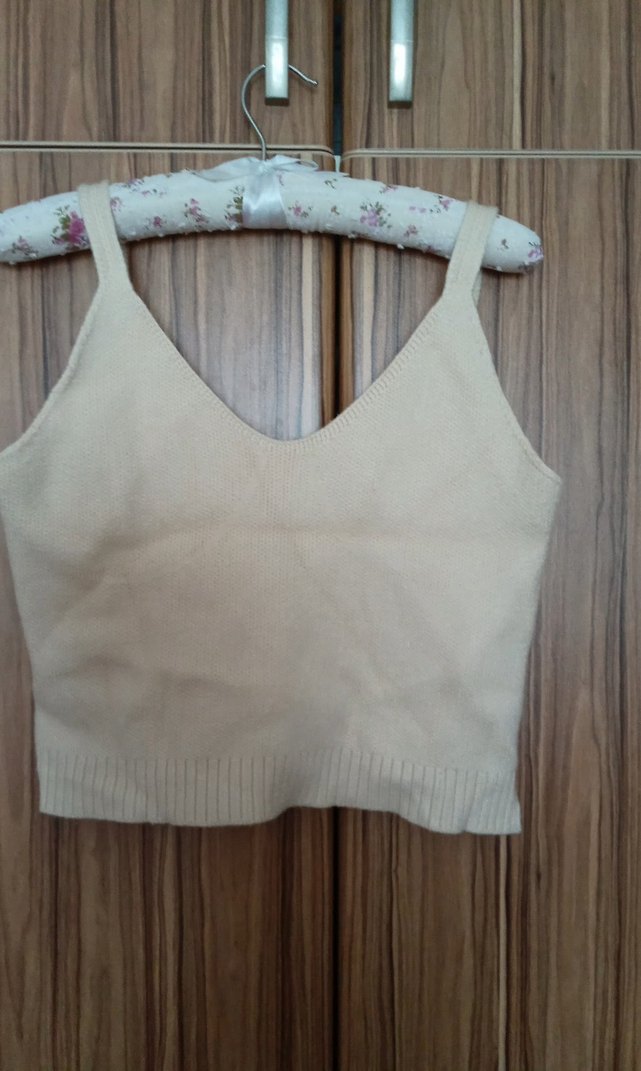 Bej renk, V yaka, örme kumaştan, kolsuz ve fitted kesim kadın atlet. Rahat ve şık, günlük kullanım için uygun.