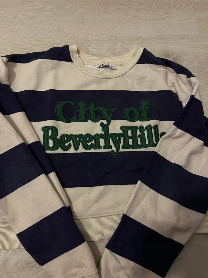 Geniş siyah ve beyaz çizgili, 'City of BeverlyHill' baskılı, pamuk örgü kumaştan, uzun kollu ve salaş kesim kadın sweatshirt. Günlük kullanıma uygun.