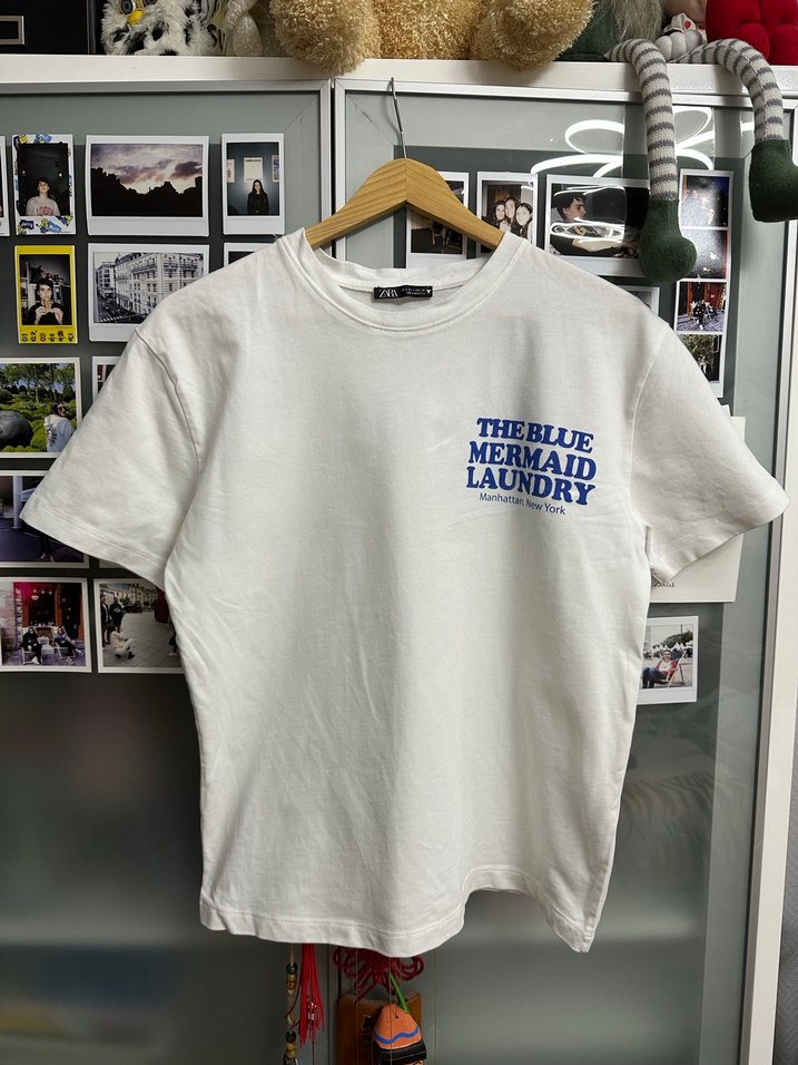 Beyaz pamuk kısa kollu tişört, rahat oversize kesim ve 'THE BLUE MERMAID LAUNDRY' baskılı yuvarlak yaka detayıyla sokak stiline uygun.