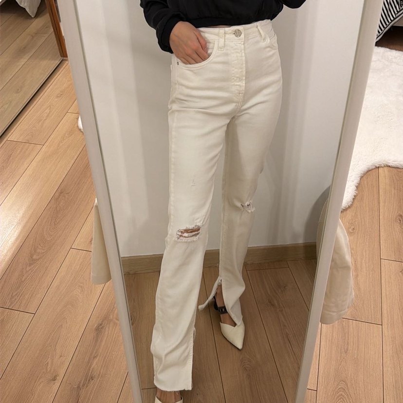Zara 32 beden ( 34 de uyumlu ) yüksel bel jean Bootcut & hafif flare paça Beyaz renk Dizinde yırtık detayı mevcut ( modelden kaynaklı ) %100 Pamuk ARKA CEP KISMINDA mavi iz mevcuttu fotoğrafta. o iz yıkayınca tamamen geçti. Alındığından beri 1 kez çekim için giyildi.