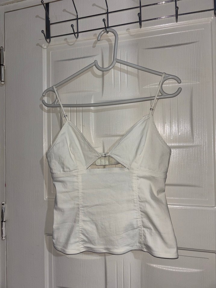 Askılı, straplez yakalı, keten kumaştan beyaz, vücuda oturan midi uzunlukta büstiyer. Günlük kullanıma uygun, sade ve şık tasarım.