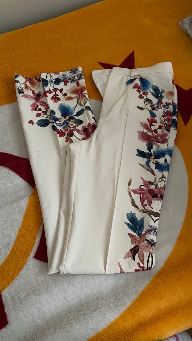 Beyaz çiçek desenli, midi boy, regular fit kadın pantolon. Yumuşak sentetik kumaştan, drapeli tasarıma sahip. Günlük kullanıma uygun bohem tarzda. Hiç giyilmedi Uyguna koydum