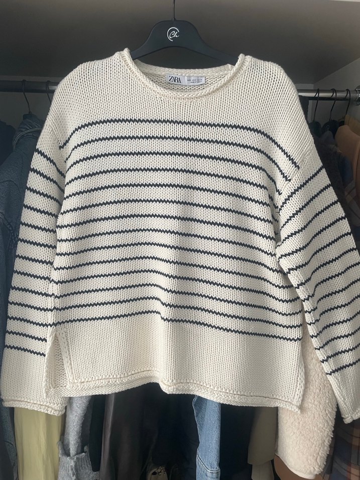 Zara marka, beyaz ve gri çizgili örgü desene sahip, uzun kollu, yuvarlak yakalı, midi uzunlukta ve bol kesim kadın kazak. Rahat ve günlük kullanıma uygun.