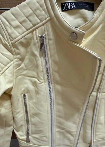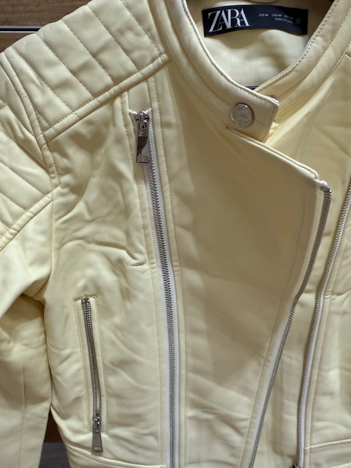 Zara markalı, beyaz deri, fermuarlı ve kesimli yakalı, şık ve fitted biker ceket.