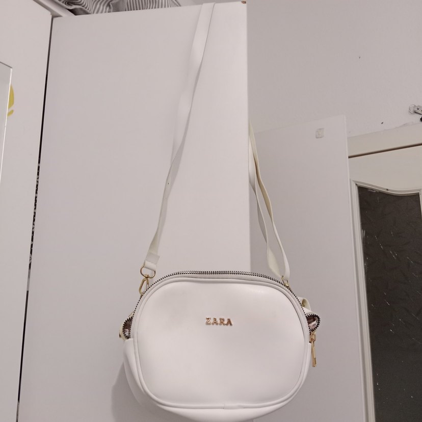 Zara marka beyaz deri çanta, fermuarlı ve minimal baskılı tasarımıyla günlük ve sokak stiline uygun.