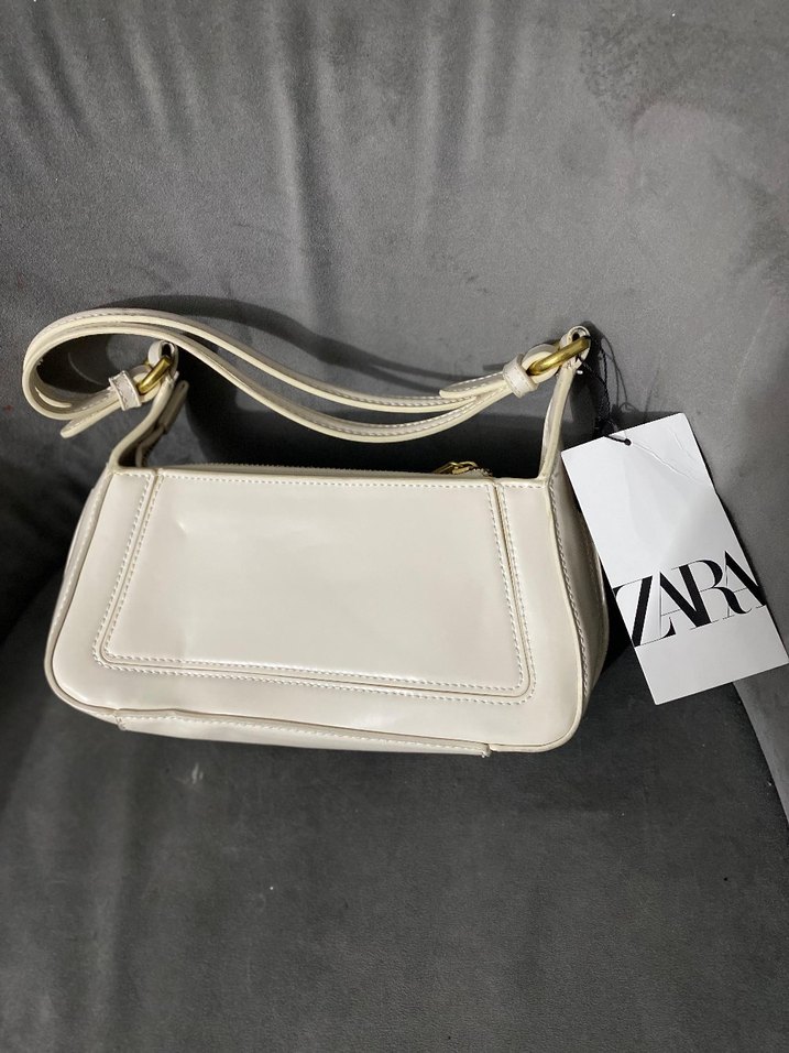 Zara'dan beyaz deri kadın çanta, fermuarlı kapama ve baskılı detaylarla modern klasik tasarım, günlük kullanım için uygundur.