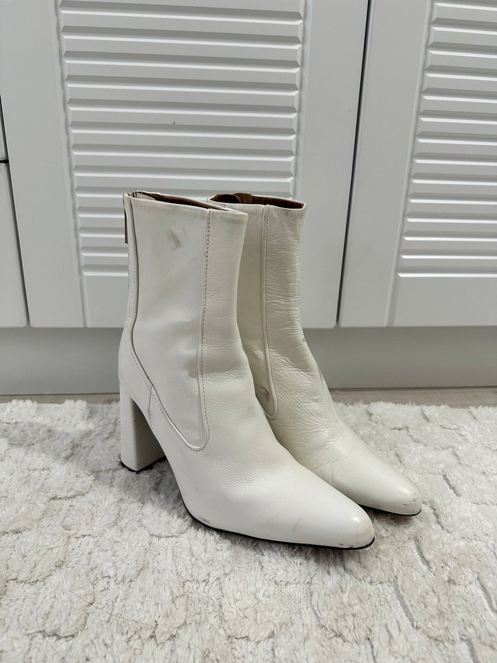 Beyaz deri, blok topuklu kadın botları fermuarlarla, minimalist ve çağdaş tasarımla ofis kullanımı için uygun. Kusurları vardır beyaz deri boyasıyla boyanabilir, arka piminin biri kopmuştur ama elle çekiliyor. Zara marka fiyat uygun tutuyorum