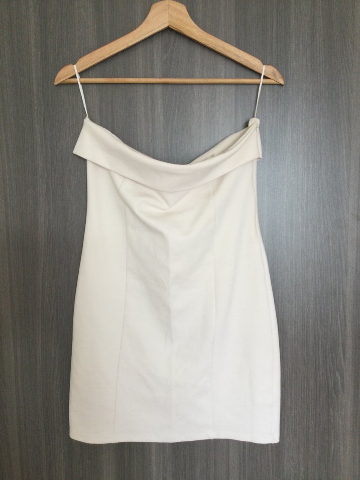 Beyaz renkte, straplez ve drapeli detaylı, vücuda oturan midi uzunlukta elbise. Minimalist ve çağdaş bir stil sunar. L-Xl
