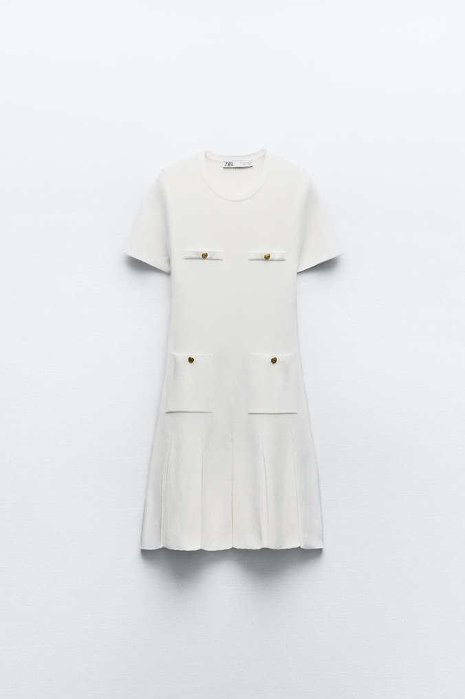 Triko kumaştan yapılmış, kısa kollu, bisiklet yaka ve düğmeli detaylara sahip beyaz mini elbise. Modern klasik tarzıyla günlük kullanıma uygundur.