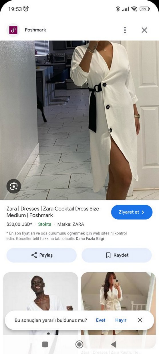 Zara markalı, düğmeli ön detaylı, uzun kollu ve notched lapel yakalı beyaz elbise. Sentetik kumaştan, rahat ve hafif görünüm sunar. Günlük sokak stiline uygun.