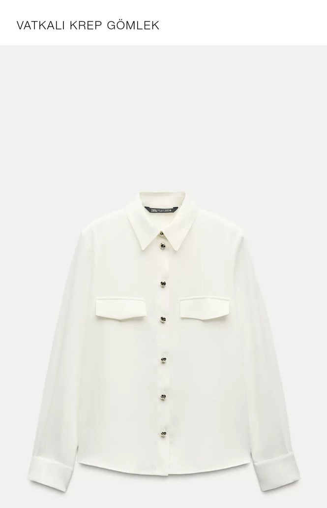 Zara şık uzun kollu kadın gömlek. Düğmeli ve yakalı, minimalist tarzda, ofis kullanımı için uygun.