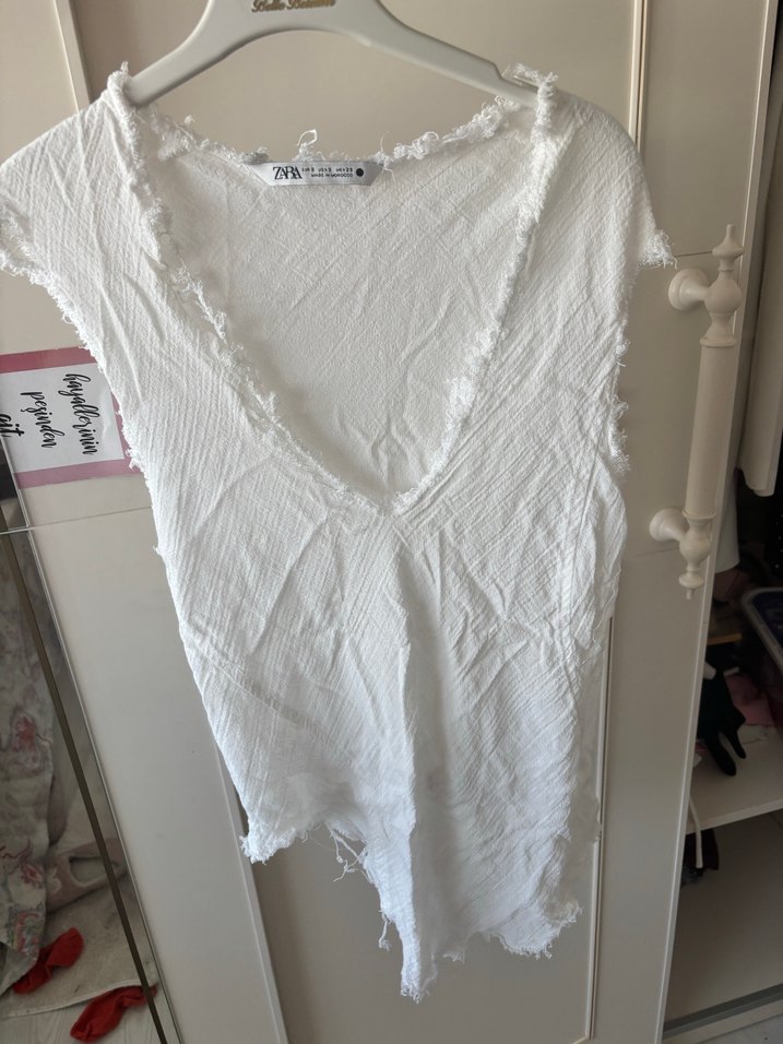 Zara Beyaz Keten V Yaka Bohem Kadın Gömlek