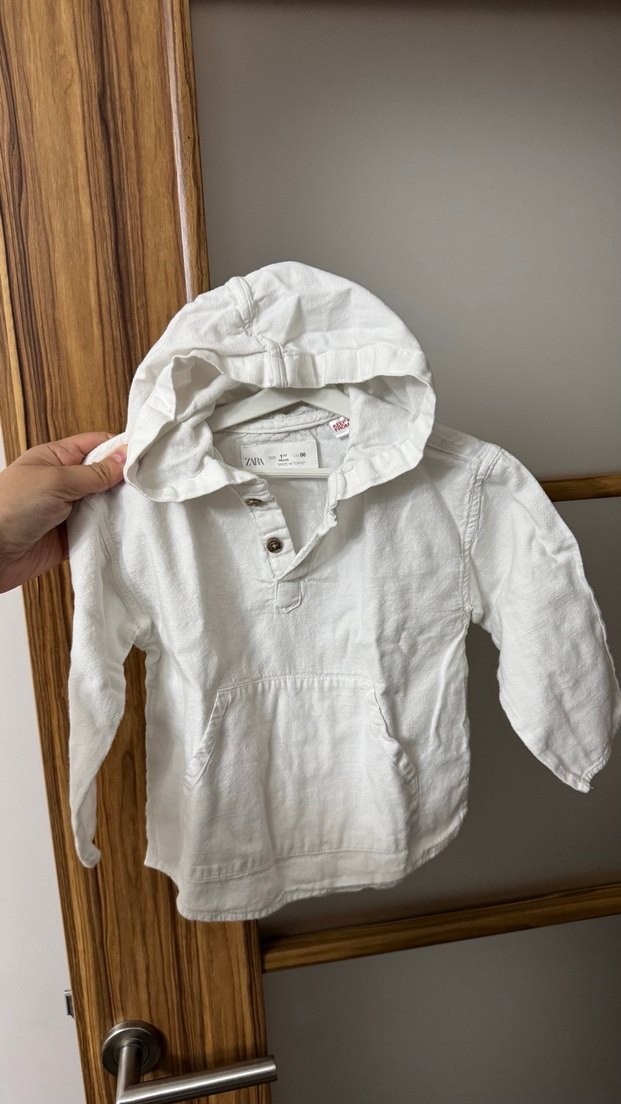 Beyaz keten uzun kollu erkek çocuk gömlek, V yaka ve düğmeli, bol kesim ve zarif baskılı detaylara sahip Zara ürünü. Keten ürün