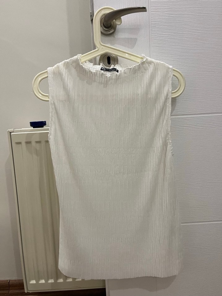 Beyaz, kolsuz, yüksek yakalı, pilili midi boy bluz