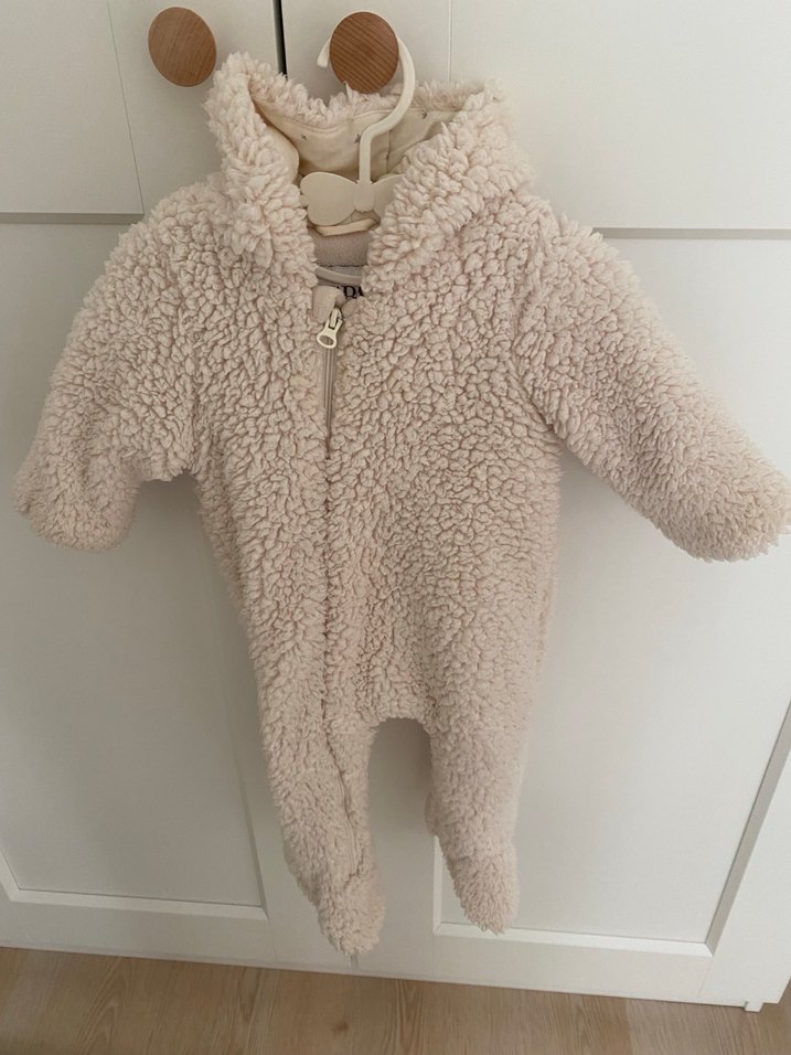 Beyaz renkte, kürklü detaylı, yakası kesik detaylı ve desensiz bebek kız tulumu. Pastel tonlarda, sıcak tutan kumaş ile tasarlanmıştır. ❄️