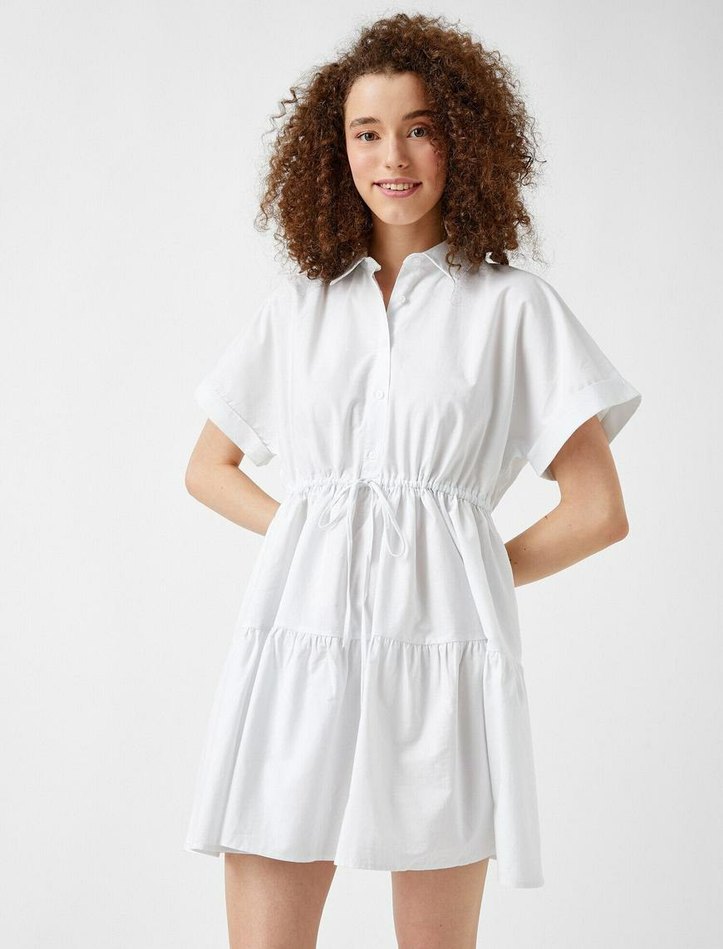 Beyaz midi boy pamuklu elbise, kısa kollu ve yakalıdır. Beli bağcıklı, bol kesim ve hafif batik desenlidir, günlük rahat şıklık sunar.