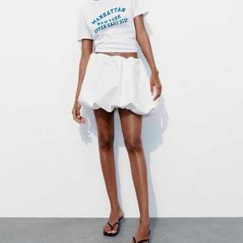 Zara Balon beyaz mini etek. Salaş kesimiyle sokak stilinde rahat kullanım sağlar. Minimalist tasarımı günlük kullanım için uygundur.