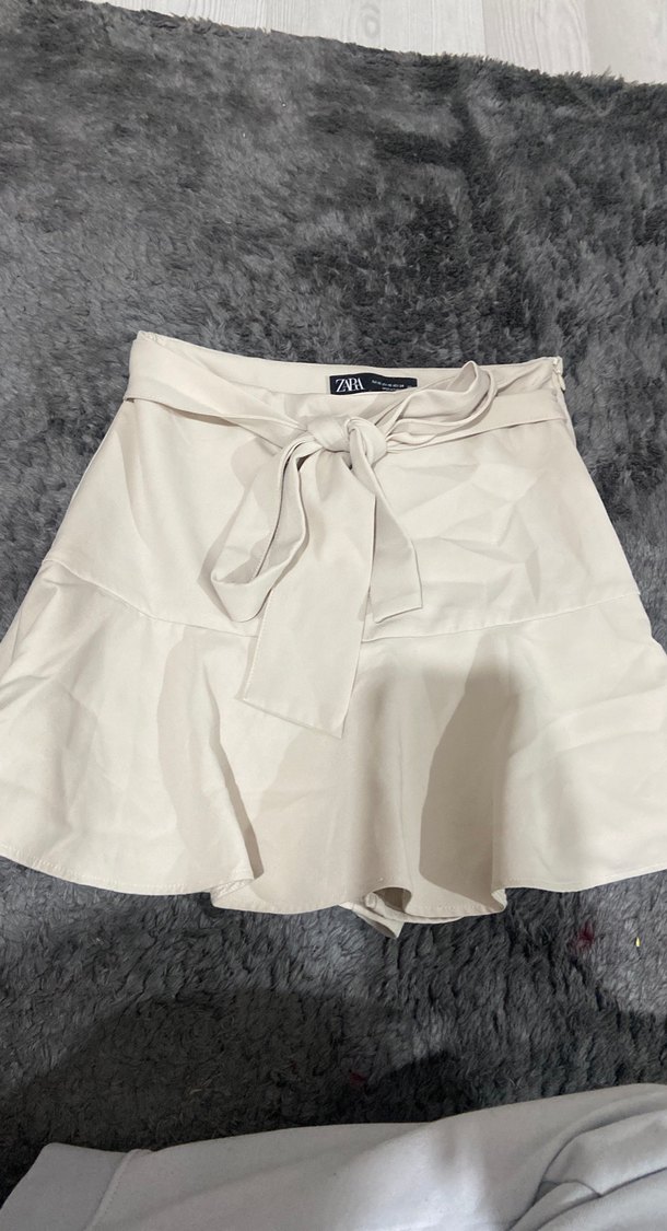 Beyaz mini etek, kürklü detaylara ve salaş kesime sahiptir. Yumuşak dokulu kumaştan yapılmış, bağlamalı beli ve günlük sokak tarzına uygundur. Arkasıda etek