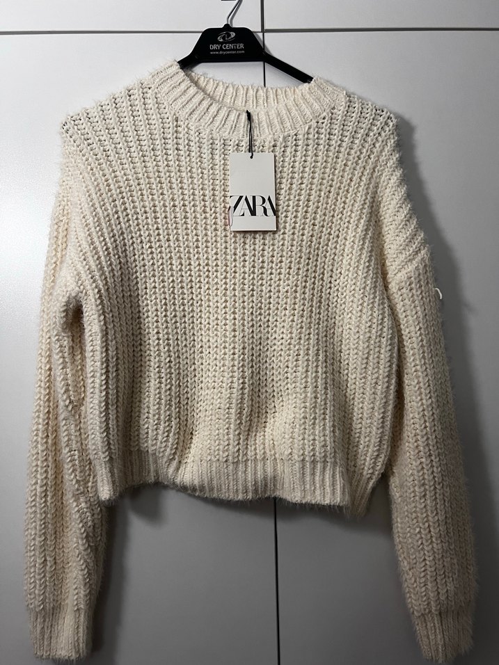 Zara marka, beyaz renkli, örgü dokulu, yuvarlak yaka ve uzun kollu kadın kazak. Rahat kesimi ve normal boyu ile günlük sokak stiline uygundur. Etiketli hiç giyilmedi xs s bedene uygun