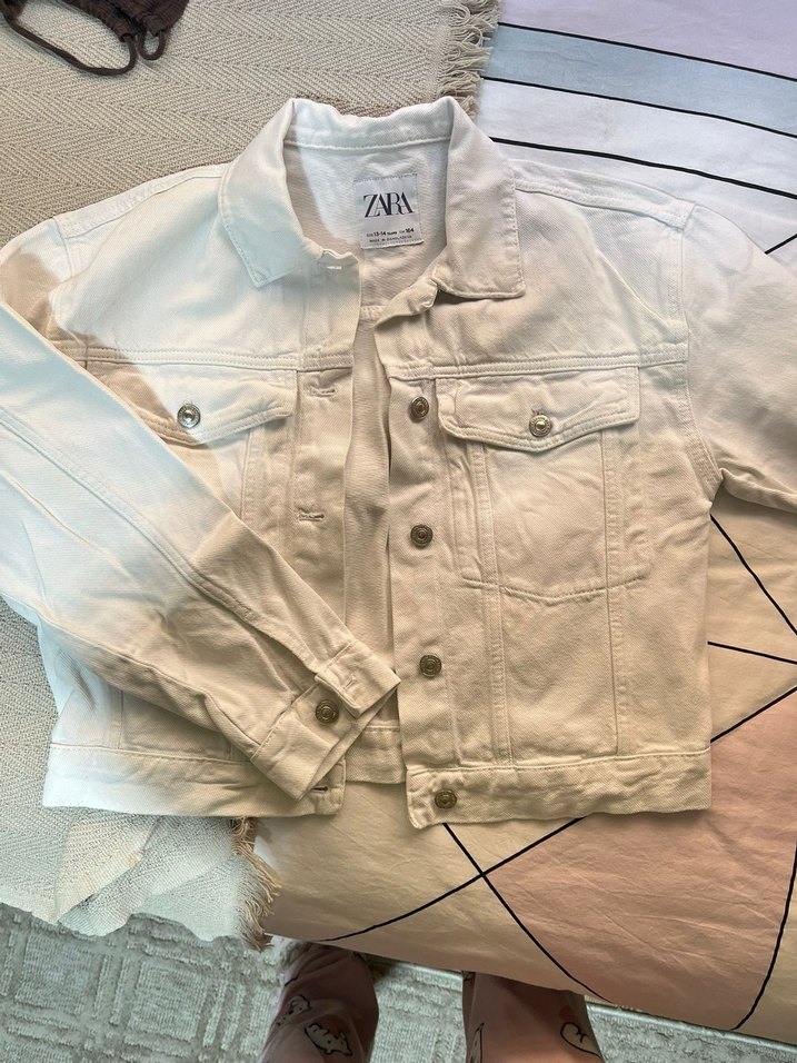 Zara marka beyaz denim ceket, düğmeli, uzun kollu ve geniş kesimdir. Pamuklu yumuşak kumaştan üretilmiş, günlük kullanıma uygundur.