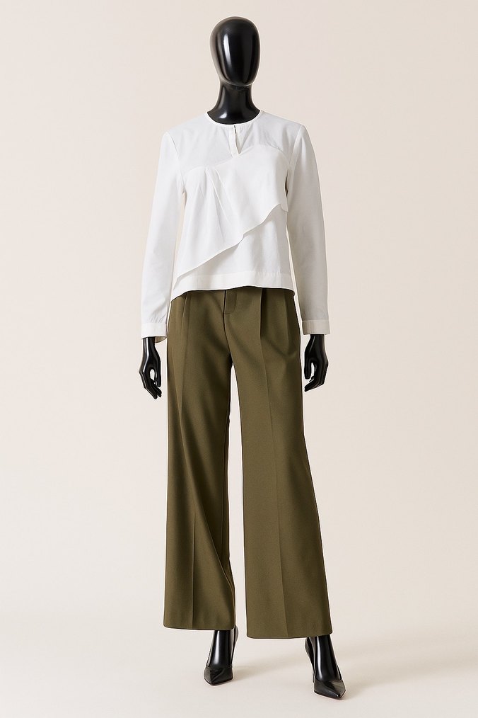 Beyaz pamuk kumaştan, uzun kollu, salaş kesim ve drapeli detaylara sahip bluz. Yuvarlak yaka ve midi boyda, minimalist tarza uygun.