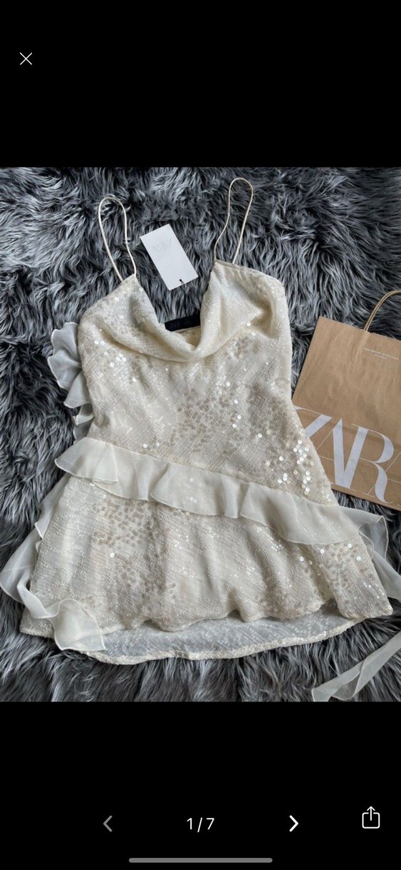 Beyaz mini zara elbisesi, straplez ve kolsuz tasarıma sahiptir. Gevşek kesimi ve ışıltılı detaylarıyla bohem ve göz alıcı bir tarza sahiptir. ✨