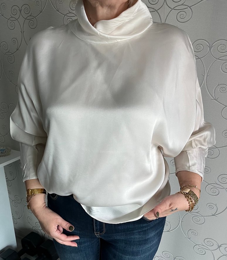 Yüksek yakalı, uzun kollu ve bol kesim beyaz bluz. L/40 beden