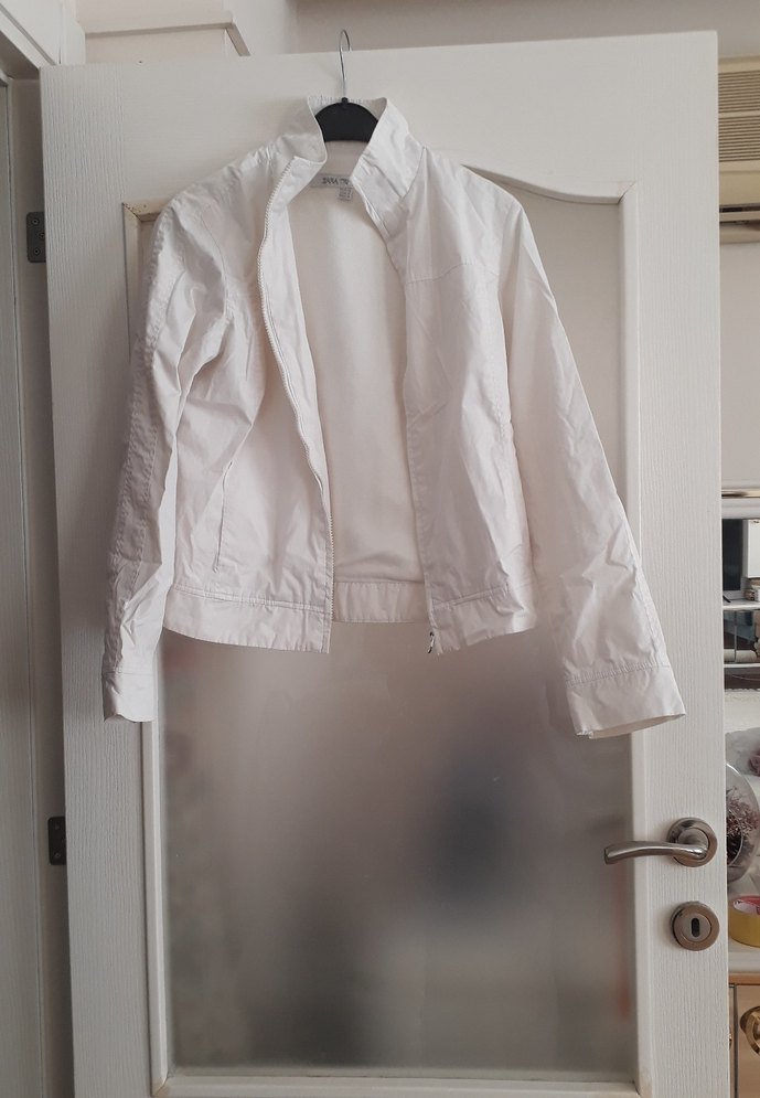 Zara marka,beyaz renk içi polar,dışı yağmurluk kumaşından,yakalı ve uzun kollu, normal kesim kadın ceket.Spor tarzında,çok kullanışlı. Beden M iki koltuk altı 44cm Uzunluk 55cm Kol uzunluk 60cm