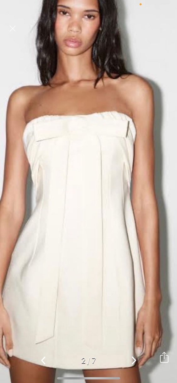 Bu beyaz mini Zara elbise, straplez yakaya ve kolsuz tasarıma sahiptir. Çağdaş, minimalist stil ve midi boyuyla şık bir görünüm sunar.