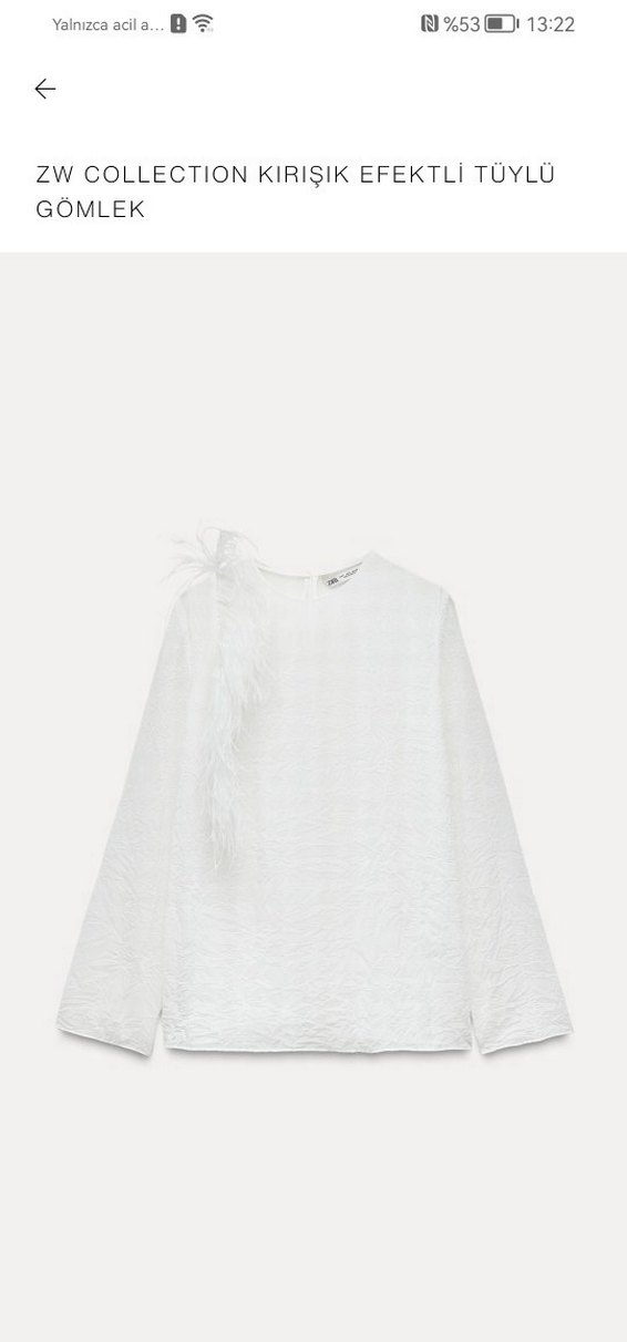 Beyaz keten kumaştan, uzun kollu, yuvarlak yaka ve gevşek kesime sahip. Tek tarafında hafif tüy detayı bulunan minimalist normcore stil bluz. Etiketli zara gömlek