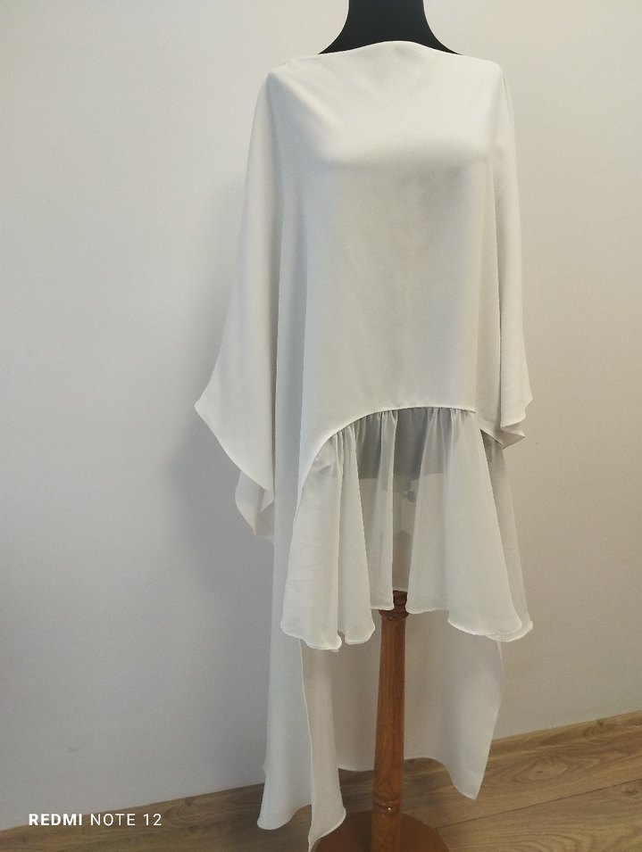 İki kol arası 85 cm. Arka boy 138 cm Ön boy yakadan tüle kadar 54 cm. Tül 30 cm Toplamda ön boy 84 cm. Ön boy uzun kumaş yan taraf 122 cm. Kadınlar için salaş kesim, drapeli beyaz uzun tunik. İpek gibi kumaştan, kolsuz, yuvarlak yaka ve düğünler için uygun modern minimal tasarım.