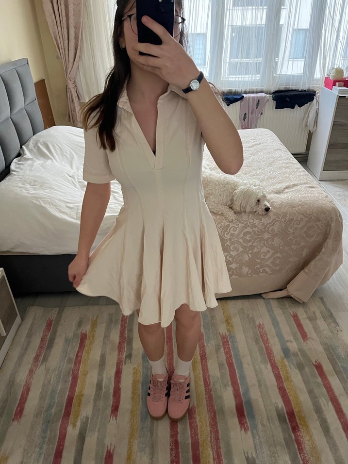 Beyaz renginde, kısa kollu ve V yakalı midi uzunlukta, vücuda oturan kadın elbisesi. İpeksi kumaştan, gündelik kullanım için rahat ve şık bir tasarım sunar. Pastel tonları ve desensiz yapısıyla Paris tarzını yansıtır.