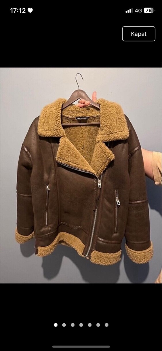 Kahverengi deri, kürklü detaylı, bol kesim, kısa boy ve yakalı mont. Askılı kollu, günlük sokak stiline uygun. M beden